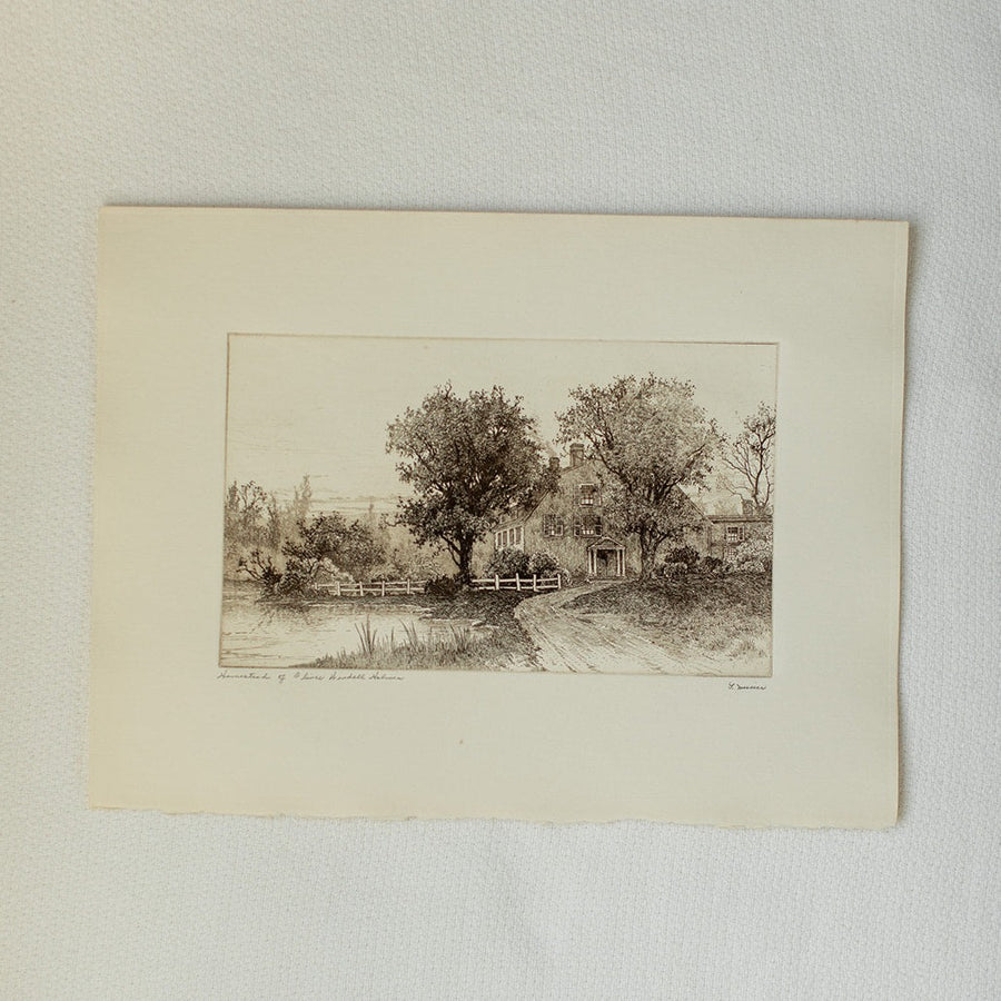 A signed antique etching of the "Homestead of Oliver Wendall Holmes" (1841–1935). Holmes was an American jurist who served as an Associate Justice of the Supreme Court of the United States from 1902 to 1932. A gorgeous piece in great condition for age. No rips, bends or tearing.